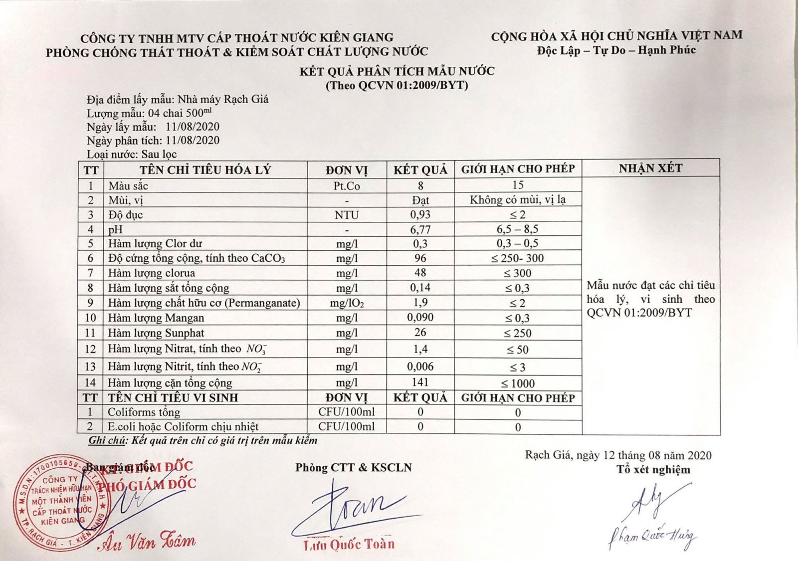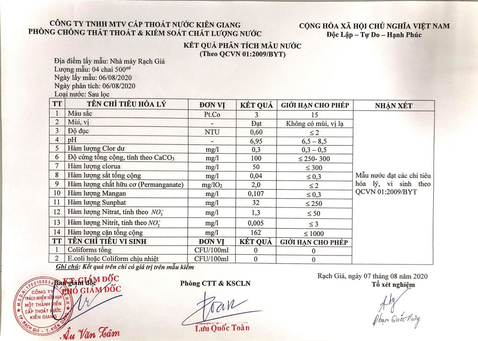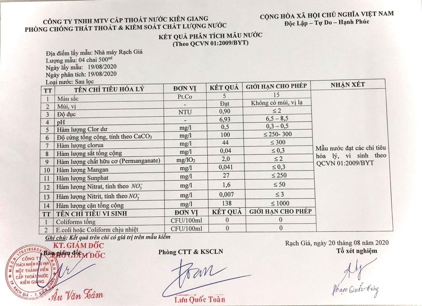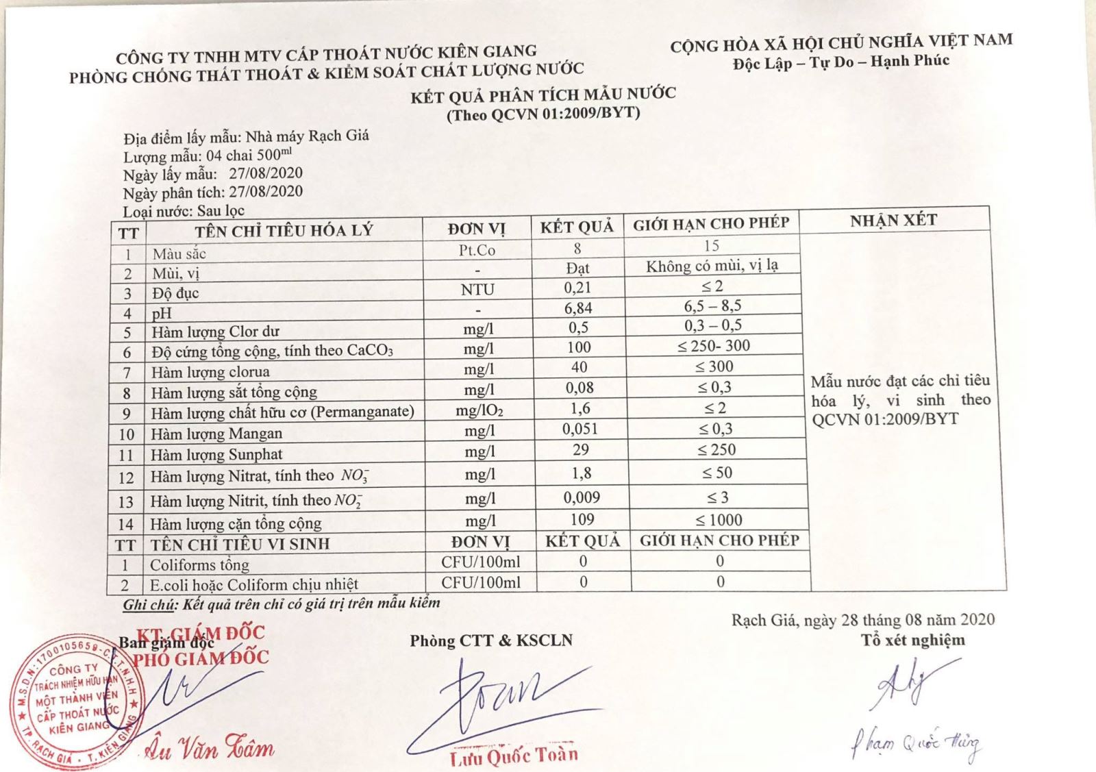 Kết quả chất lượng nước thành phẩm Nhà máy nước Rạch Giá tháng 08/2020