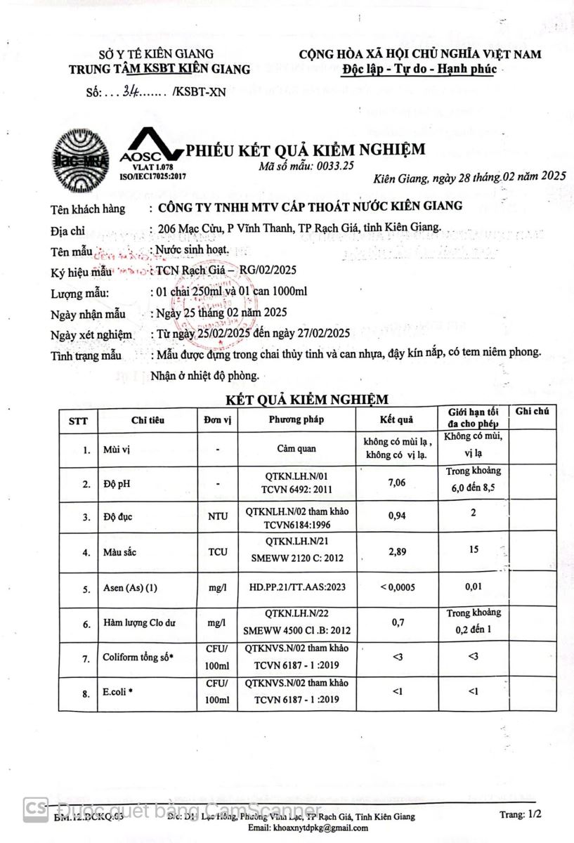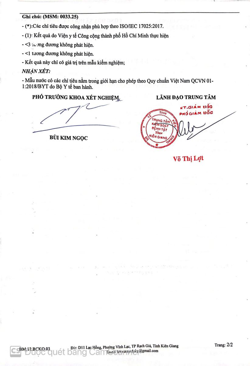 Kết quả kiểm nghiệm của Trung tâm Kiểm soát bệnh tật Kiên Giang tháng 02 năm 2025