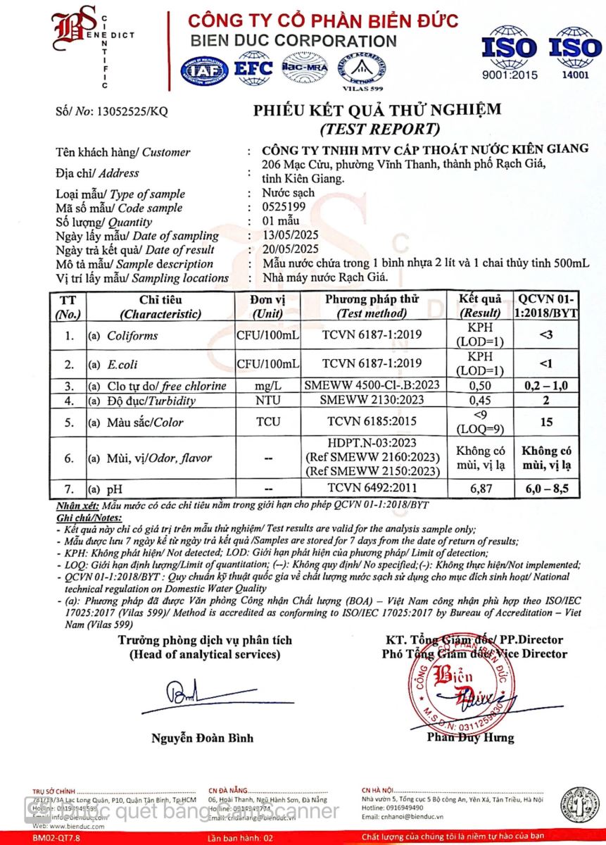 Kết quả kiểm nghiệm của Công Ty Cổ Phần Khoa Học Công Nghệ Phân Tích Môi Trường Biển Đức tháng 05 năm 2025