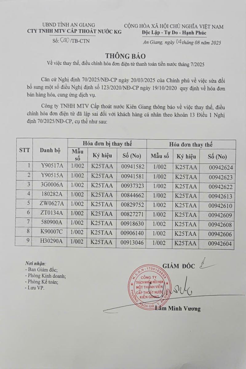 Thông báo việc thay thế, điều chỉnh hóa đơn điện tử thanh toán tiền nước tháng 7/2025.