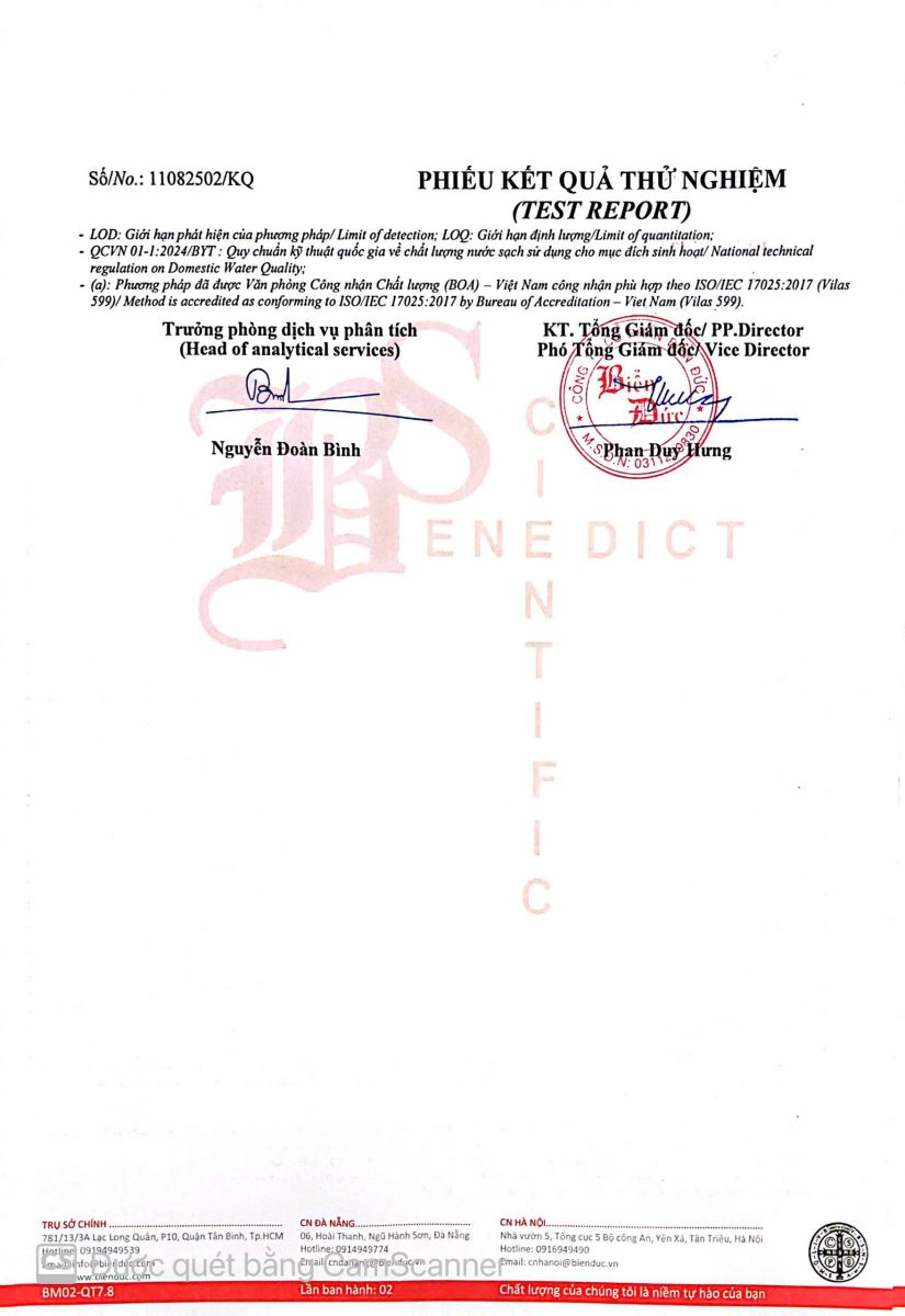 Kết quả kiểm nghiệm của Công Ty Cổ Phần Khoa Học Công Nghệ Phân Tích Môi Trường Biển Đức tháng 08 năm 2025