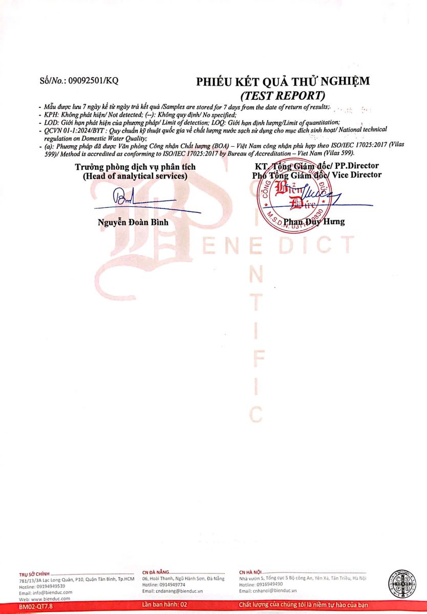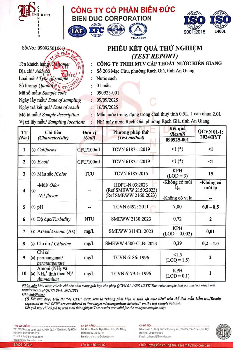 Kết quả kiểm nghiệm của Công Ty Cổ Phần Khoa Học Công Nghệ Phân Tích Môi Trường Biển Đức tháng 09 năm 2025