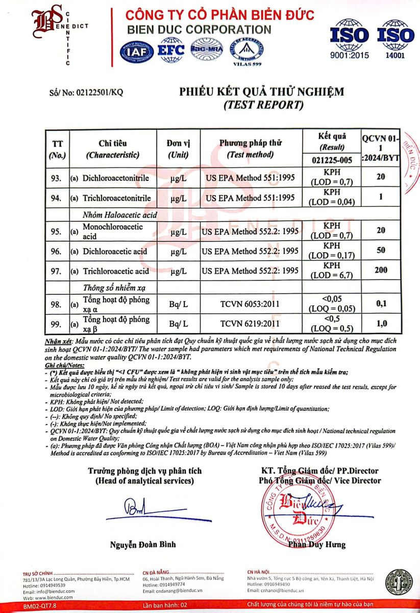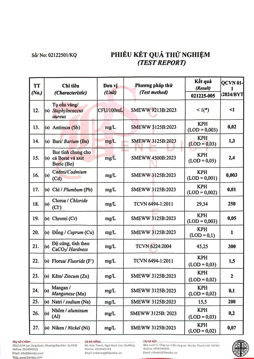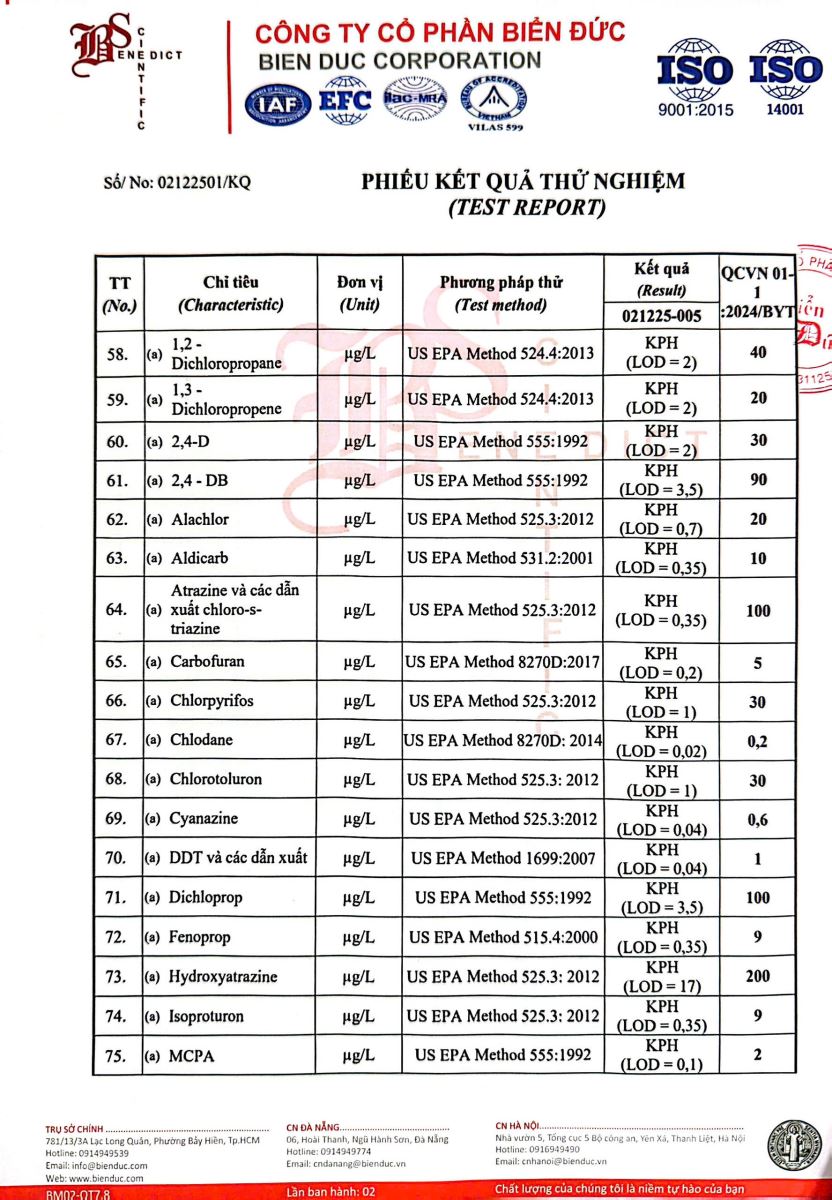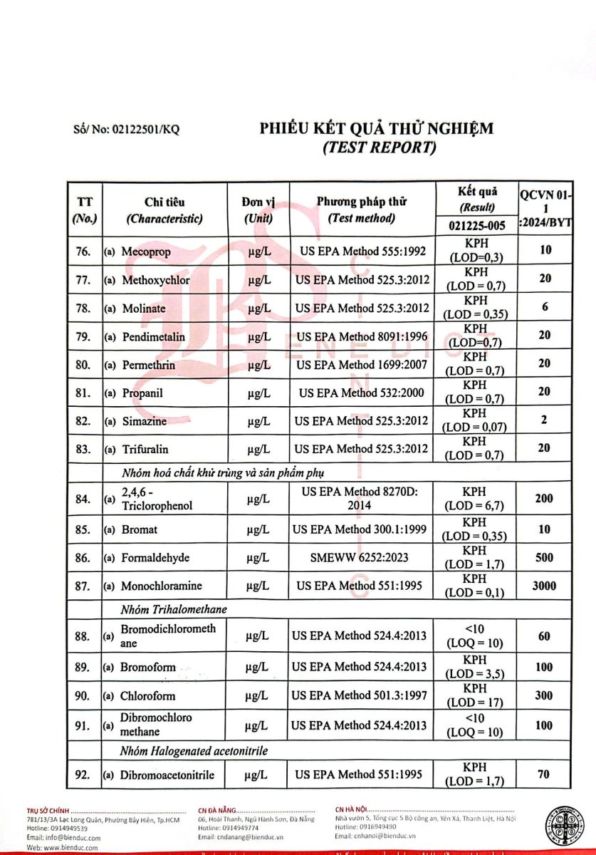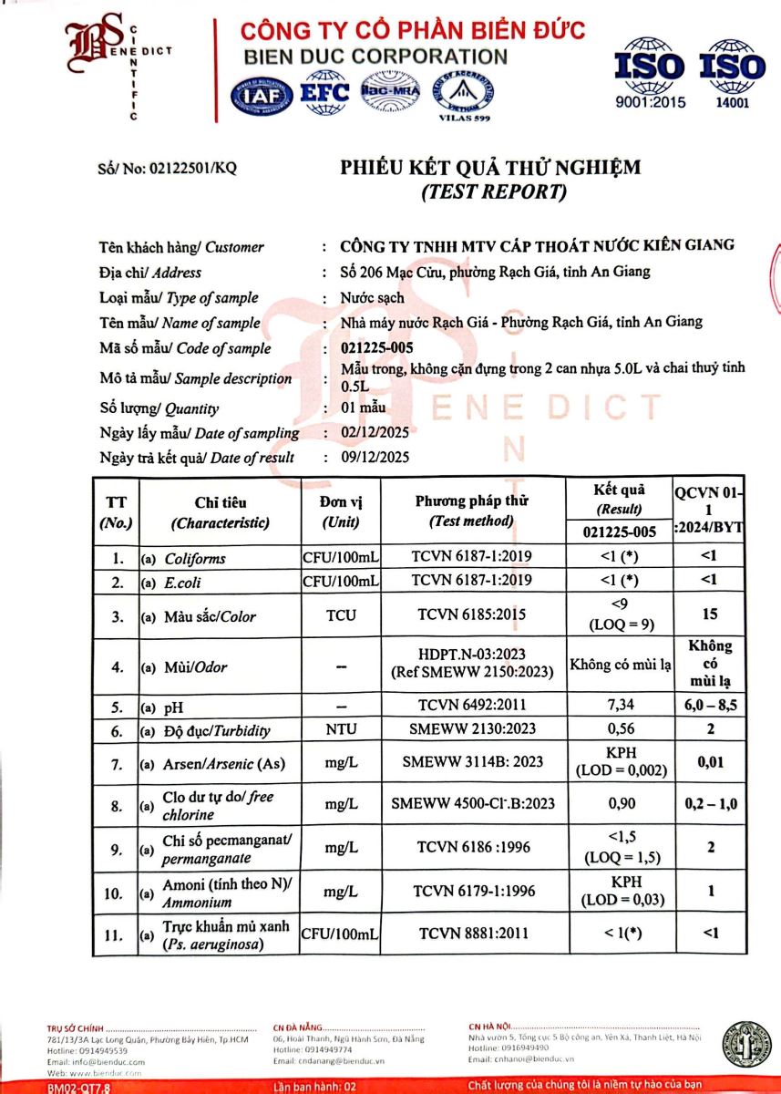 Kết quả kiểm nghiệm của Công Ty Cổ Phần Khoa Học Công Nghệ Phân Tích Môi Trường Biển Đức tháng 12 năm 2025