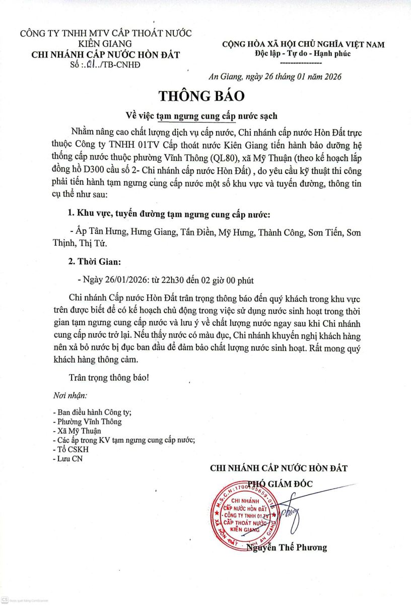 Thông báo tạm ngưng cung cấp nước sạch
