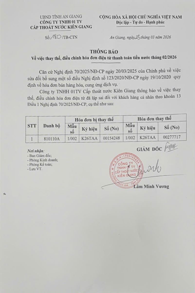 Thông báo việc thay thế, điều chỉnh hóa đơn điện tử thanh toán tiền nước tháng 02/2026