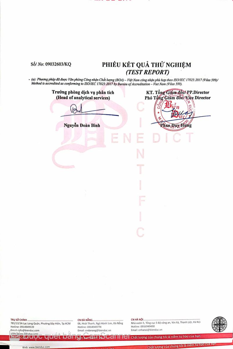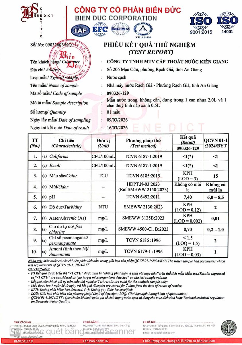 Kết quả kiểm nghiệm của Công Ty Cổ Phần Khoa Học Công Nghệ Phân Tích Môi Trường Biển Đức tháng 03 năm 2026