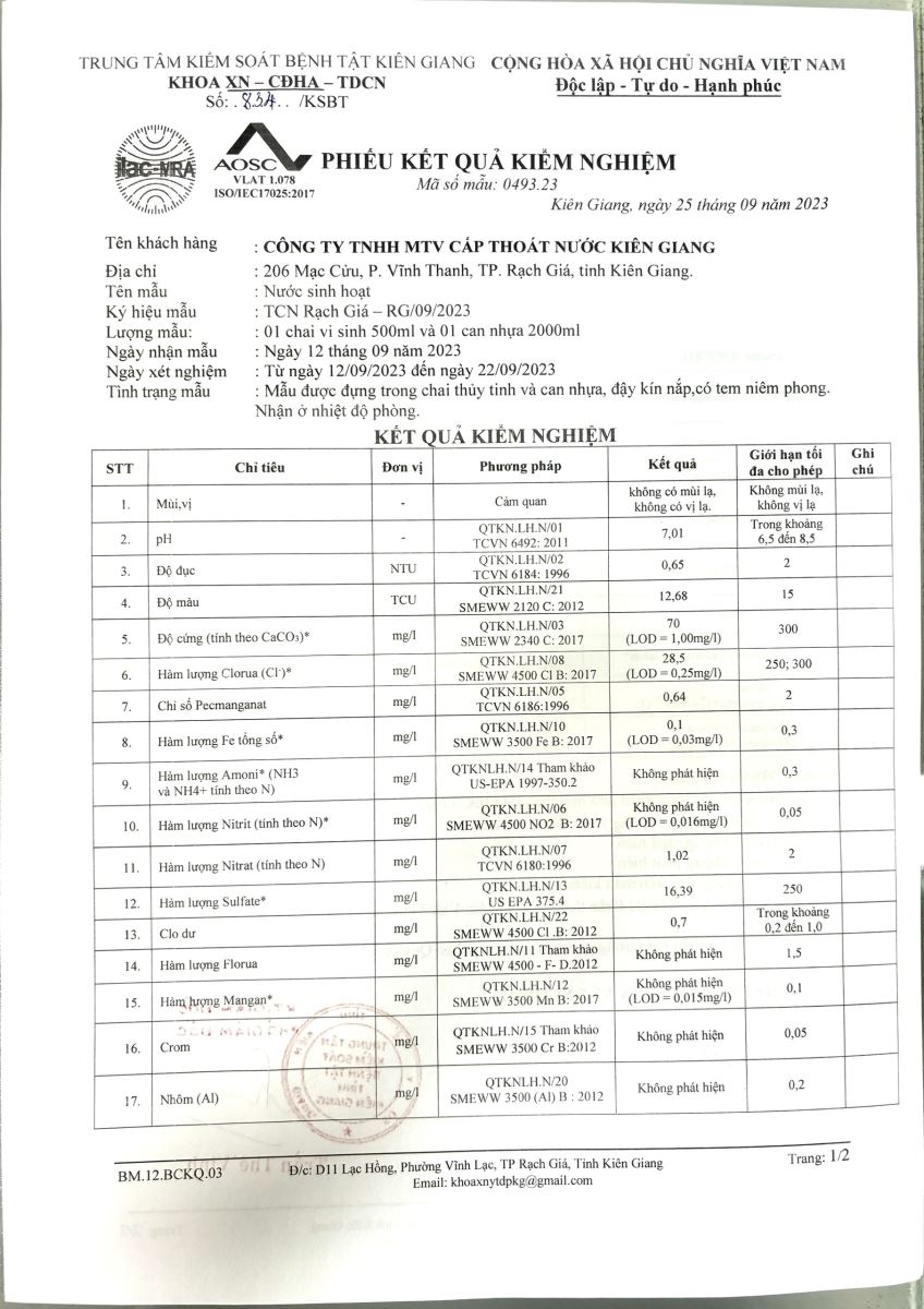 Kết quả kiểm nghiệm của Trung tâm Kiểm soát bệnh tật Kiên Giang tháng 9/2023
