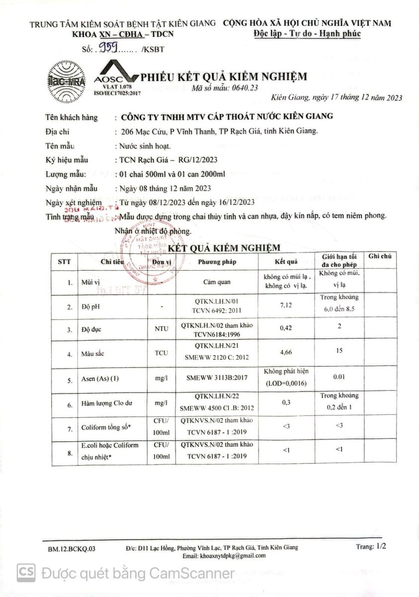 Kết quả kiểm nghiệm của Trung tâm Kiểm soát bệnh tật Kiên Giang tháng 12/2023