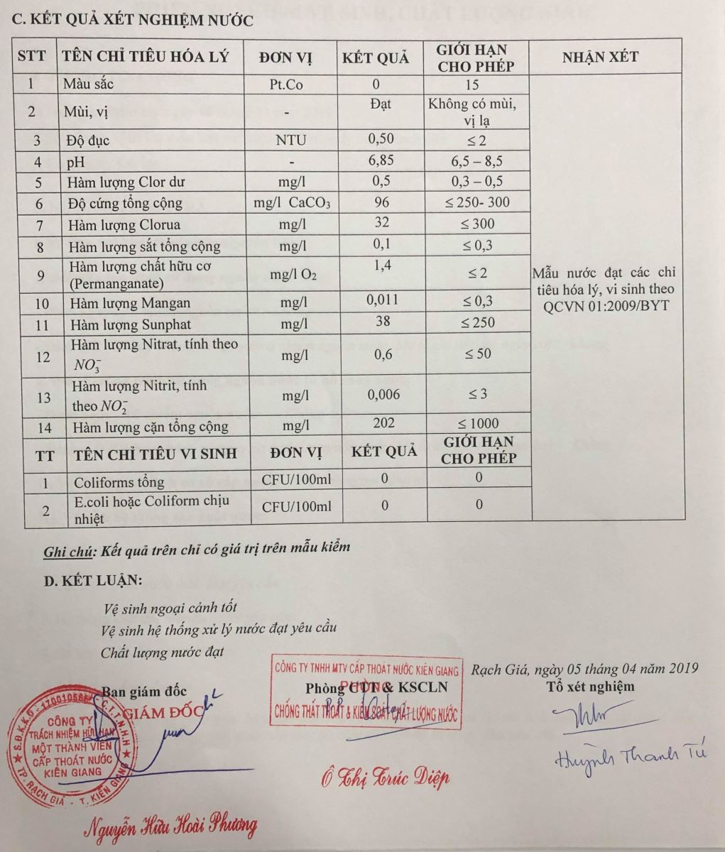Kết quả chất lượng nước thành phẩm Nhà máy Nước Rạch Giá tháng 04/2019