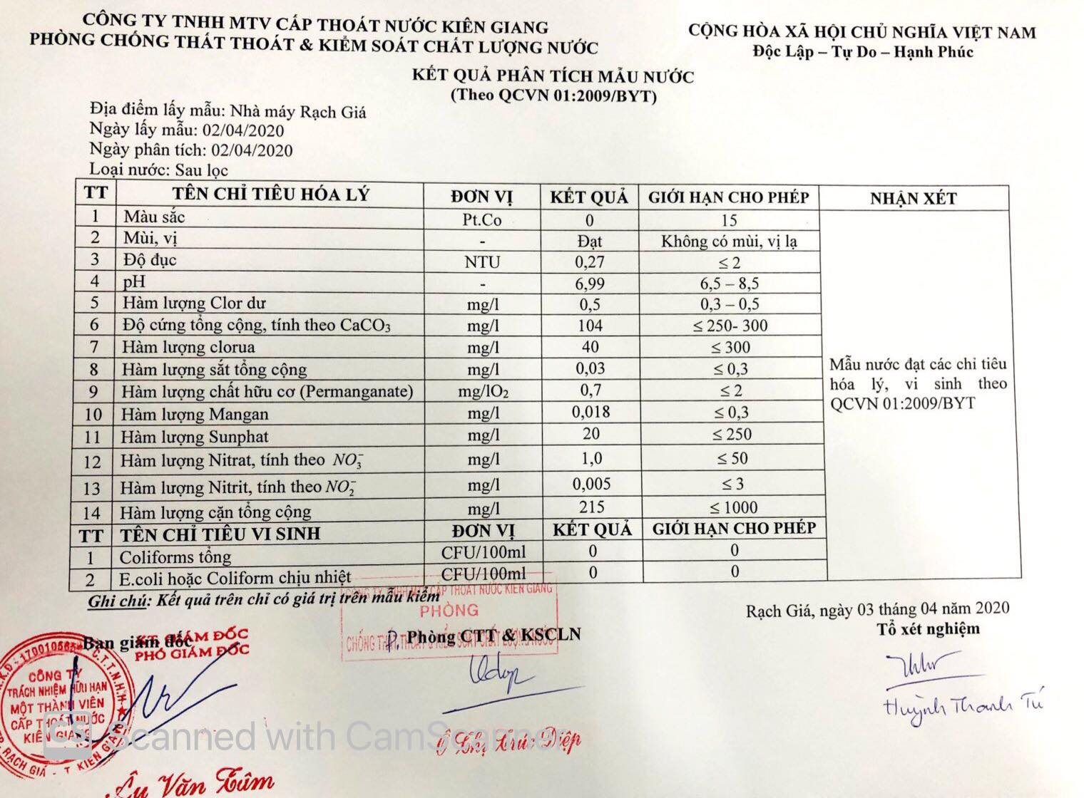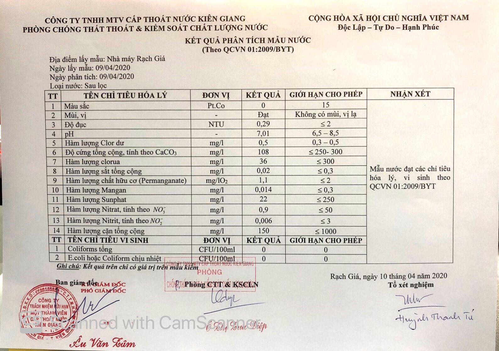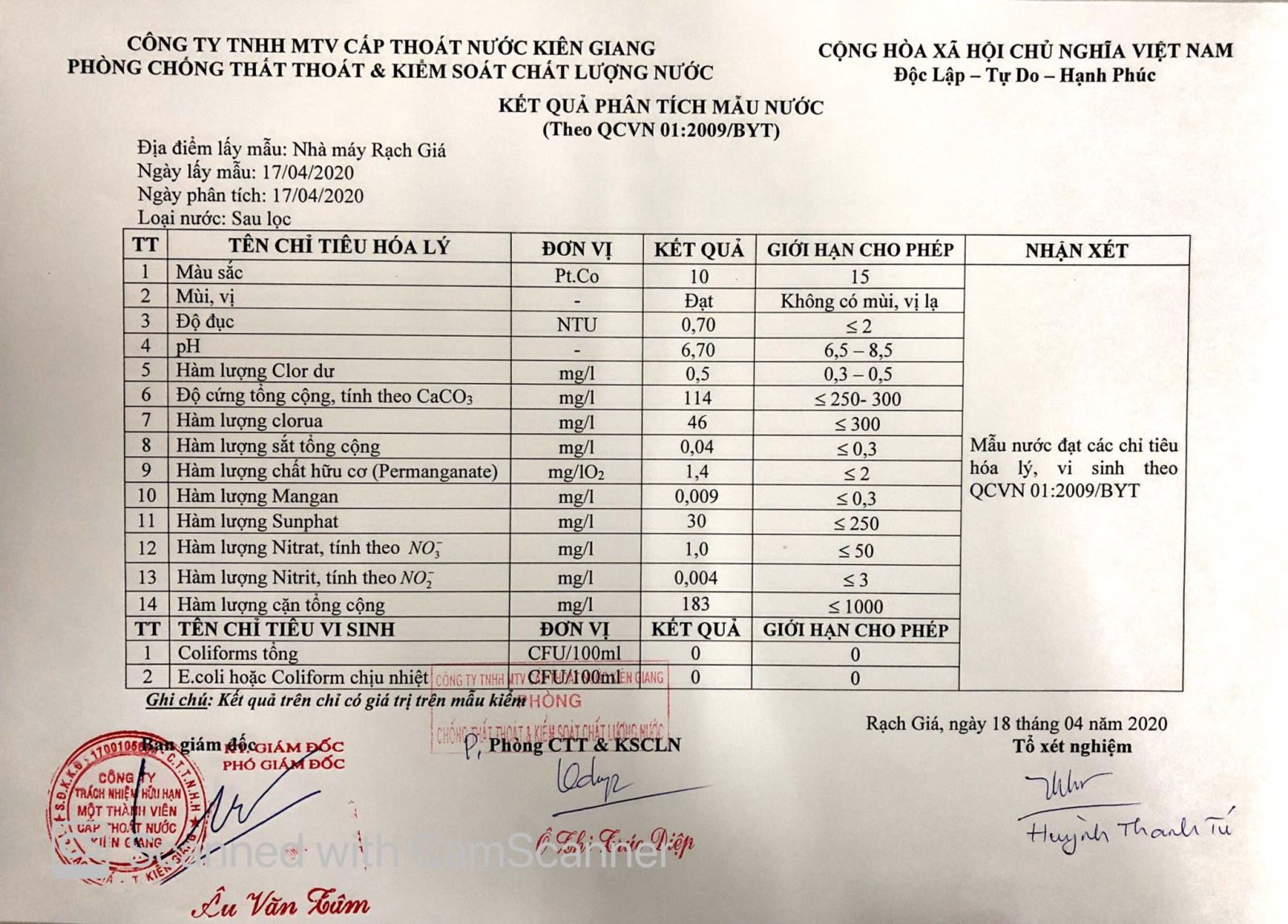 Kết quả chất lượng nước thành phẩm Nhà máy nước Rạch Giá tháng 04/2020